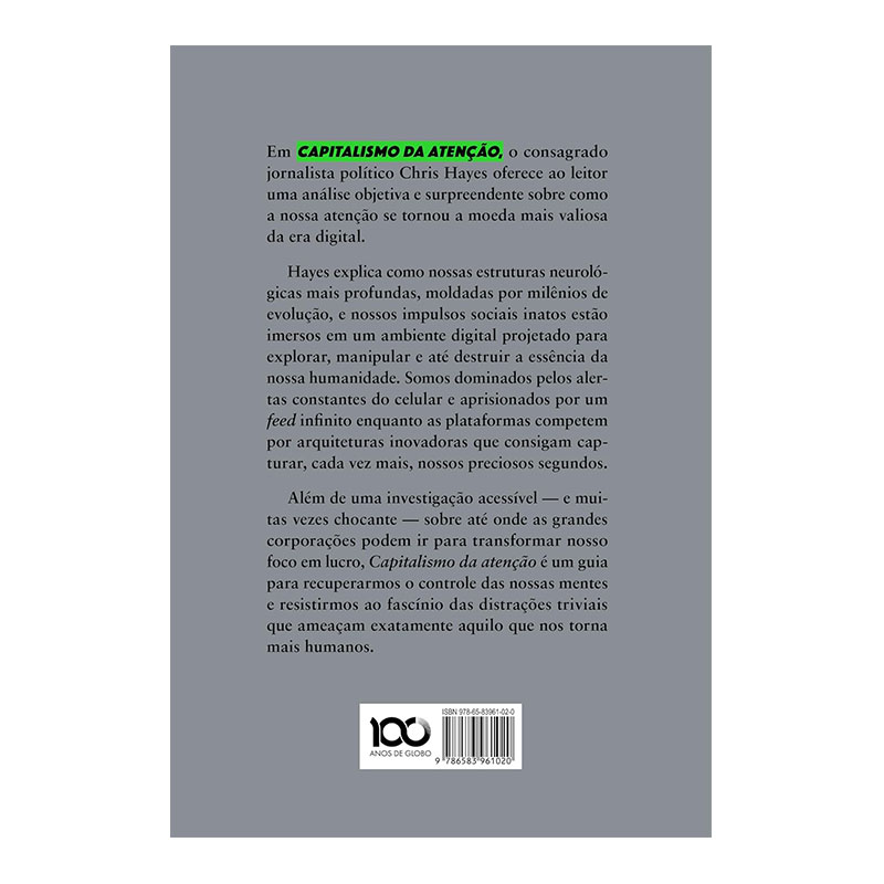 Em meio a notificações incessantes, feeds infinitos e algoritmos cuidadosamente desenhados para prender nossos olhos e moldar nossos desejos, o premiado jornalista e escritor Chris Hayes investiga como a atenção humana se transformou em uma das mercadorias mais exploradas do século XXI. Nesta obra provocadora, o autor revela como gigantes da tecnologia constroem ecossistemas digitais que exploram nossas vulnerabilidades cognitivas e emocionais, convertendo segundos de distração em bilhões de dólares.
