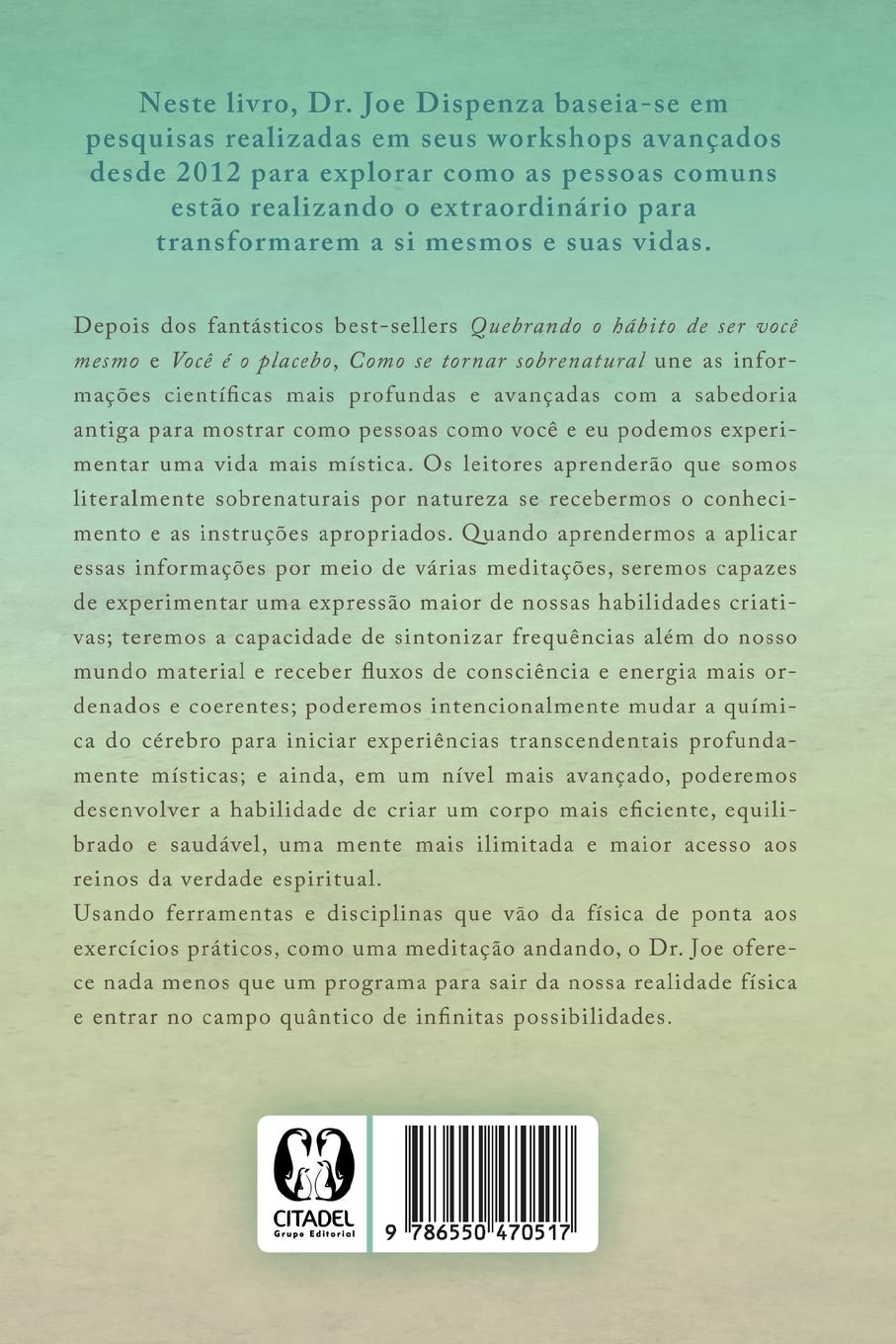 Neste livro, Dr. Joe Dispenza baseia-se em pesquisas realizadas em seus workshops avançados desde 2012 para explorar como as pessoas comuns estão realizando o extraordinário para transformarem a si mesmos e suas vidas. Depois dos fantásticos best-sellers Quebrando o hábito de ser você mesmo e Você é o Placebo, Sobrenatural une as informações científicas mais profundas e avançadas com a sabedoria antiga para mostrar como pessoas como você e eu podemos experimentar uma vida mais mística. Os leitores aprenderão que somos literalmente sobrenaturais por natureza, se recebermos o conhecimento e as instruções apropriados. Quando aprendermos a aplicar essas informações por meio de várias meditações, seremos capazes de experimentar uma expressão maior de nossas habilidades criativas; teremos a capacidade de sintonizar frequências além do nosso mundo material e receber fluxos de consciência e energia mais ordenados e coerentes; poderemos intencionalmente mudar a química do cérebro para iniciar experiências transcendentais profundamente místicas; e ainda, em um nível mais avançado, poderemos desenvolver a habilidade de criar um corpo mais eficiente, equilibrado e saudável, uma mente mais ilimitada e maior acesso aos reinos da verdade espiritual. Os tópicos deste livro incluem: • Desmistificando os 7 centros de energia do corpo e como você pode equilibrá-los para curar • Como se libertar do passado, recondicionando seu corpo a uma nova mente • Como você pode criar realidade no momento presente generoso, mudando sua energia • A diferença entre criação de terceira dimensão e criação de quinta dimensão • A ciência secreta da glândula pineal e seu papel no acesso aos reinos místicos da realidade • A distinção entre realidades espaço-tempo versus tempo-espaço • E muito mais
