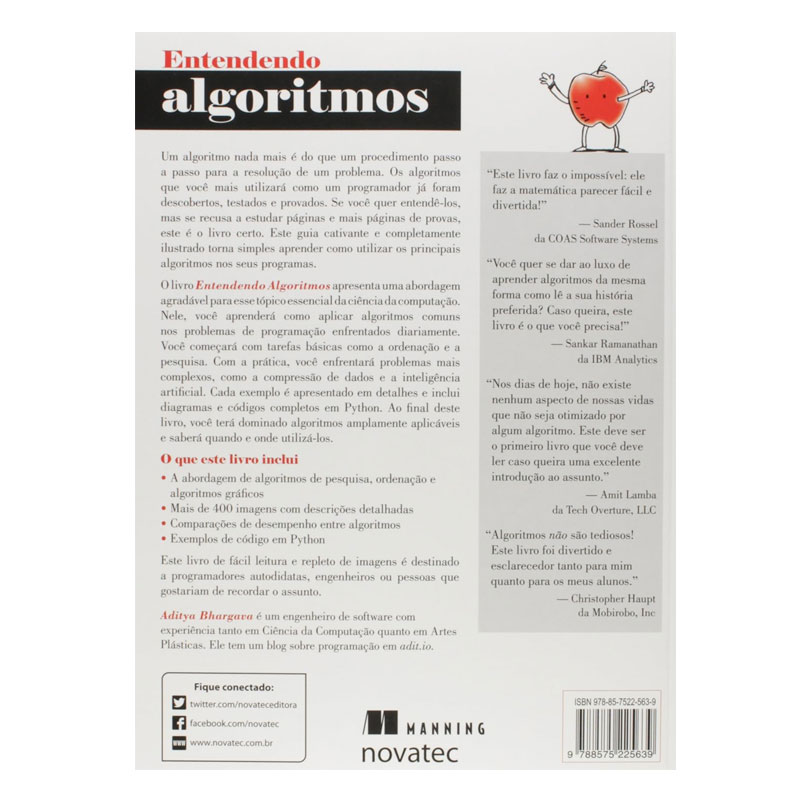 Um guia ilustrado para programadores e outros curiosos. Um algoritmo nada mais é do que um procedimento passo a passo para a resolução de um problema. Os algoritmos que você mais utilizará como um programador já foram descobertos, testados e provados. Se você quer entendê-los, mas se recusa a estudar páginas e mais páginas de provas, este é o livro certo. Este guia cativante e completamente ilustrado torna simples aprender como utilizar os principais algoritmos nos seus programas. O livro Entendendo Algoritmos apresenta uma abordagem agradável para esse tópico essencial da ciência da computação. Nele, você aprenderá como aplicar algoritmos comuns nos problemas de programação enfrentados diariamente. Você começará com tarefas básicas como a ordenação e a pesquisa. Com a prática, você enfrentará problemas mais complexos, como a compressão de dados e a inteligência artificial. Cada exemplo é apresentado em detalhes e inclui diagramas e códigos completos em Python. Ao final deste livro, você terá dominado algoritmos amplamente aplicáveis e saberá quando e onde utilizá-los. O que este livro inclui A abordagem de algoritmos de pesquisa, ordenação e algoritmos gráficos Mais de 400 imagens com descrições detalhadas Comparações de desempenho entre algoritmos Exemplos de código em Python Este livro de fácil leitura e repleto de imagens é destinado a programadores autodidatas, engenheiros ou pessoas que gostariam de recordar o assunto.
