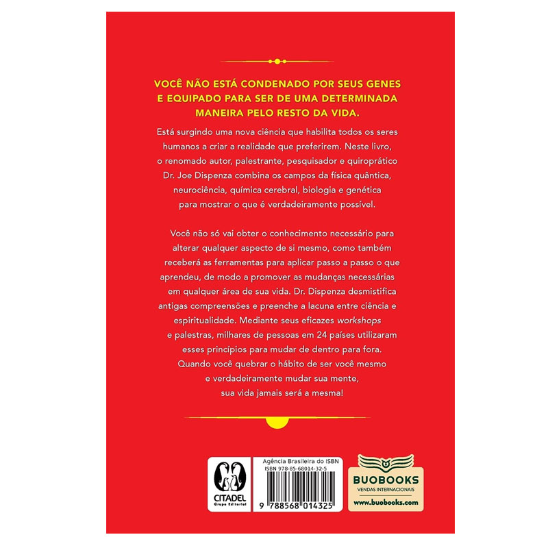Você não está condenado por seus genes e programado para ser de uma determinada maneira no restante de sua vida. Está emergindo uma nova ciência que habilita todos os seres humanos a criarem a realidade que preferirem. Neste livro, o renomado autor, palestrante, pesquisador e quiroprático Dr. Joe Dispenza combina os campos da física quântica, neurociência, química cerebral, biologia e genética para mostrar o que é realmente possível. Não só você vai ter o conhecimento necessário para alterar qualquer aspecto de si mesmo, mas também receberá as ferramentas, passo a passo, para aplicar o que aprendeu, de modo a promover as mudanças necessárias em qualquer área de sua vida. O Dr. Joe desmistifica os estudos antigos e preenche a lacuna entre a ciência e a espiritualidade. Através de suas eficazes oficinas e palestras, milhares de pessoas em 24 países diferentes têm utilizado esses princípios para mudar de dentro para fora. Quando você quebra o hábito de ser você mesmo e realmente muda sua mente, sua vida jamais será a mesma!